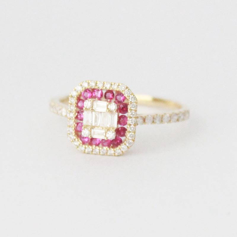 ANILLO DE ORO AMARILLO RECTANGULO DE BRILLANTES CON RUBI