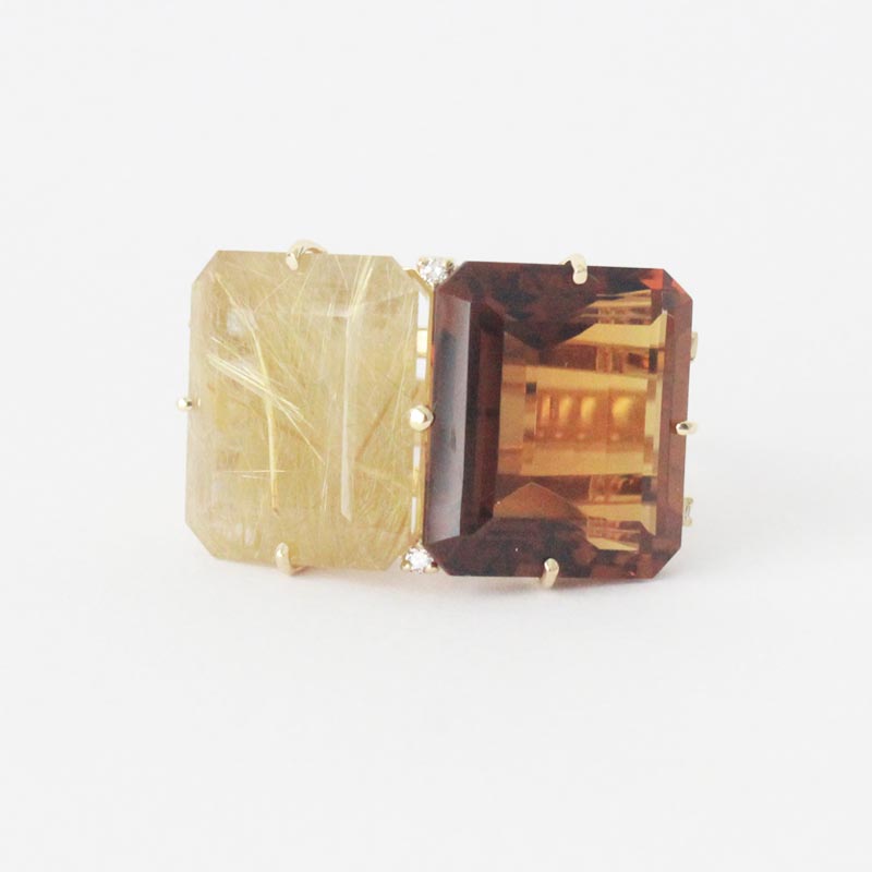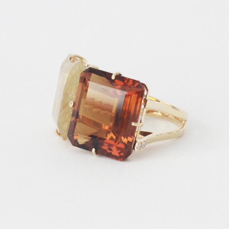 ANILLO DE ORO AMARILLO TOPACIO RUTILADO Y TOPACIO AHUMADO