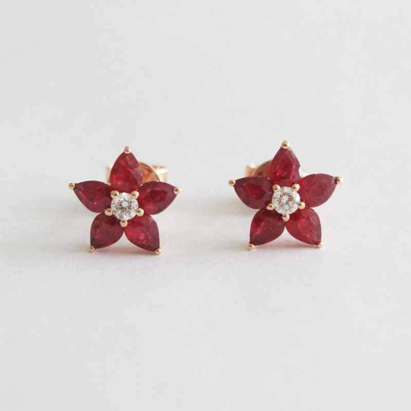 ARETES DE ORO AMARILLO FLOR CUATRO PETALOS DE RUBI