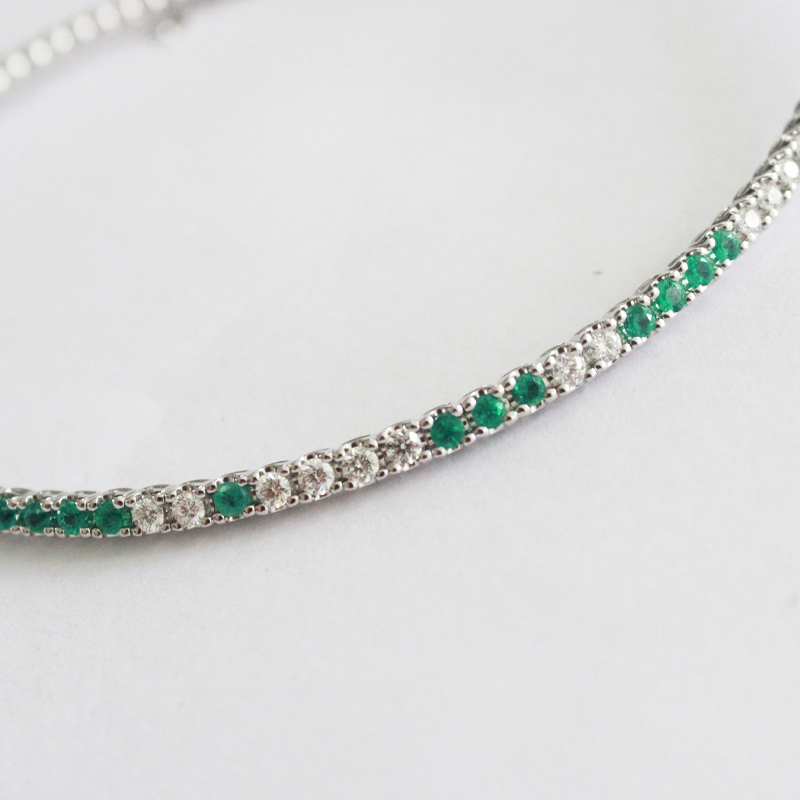 COLLAR DE ORO BLANCO TENIS TIPO CHOCKER TE BRILLANTES Y ESMERALDAS